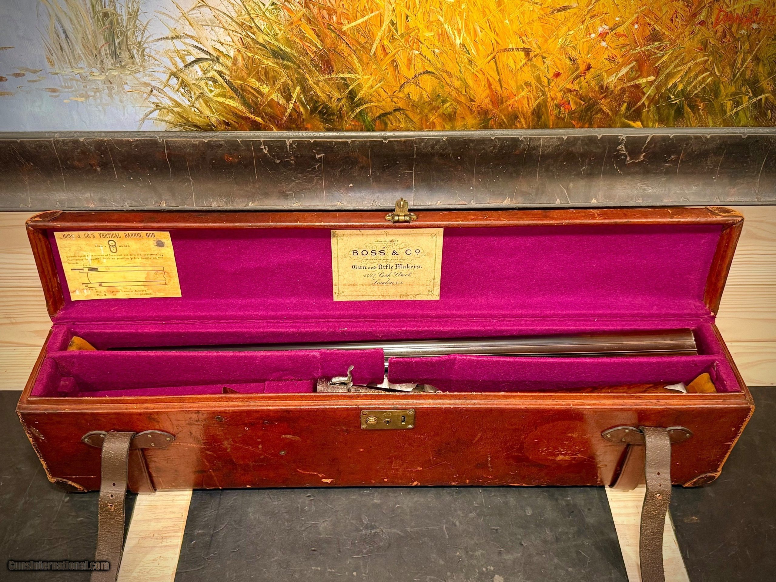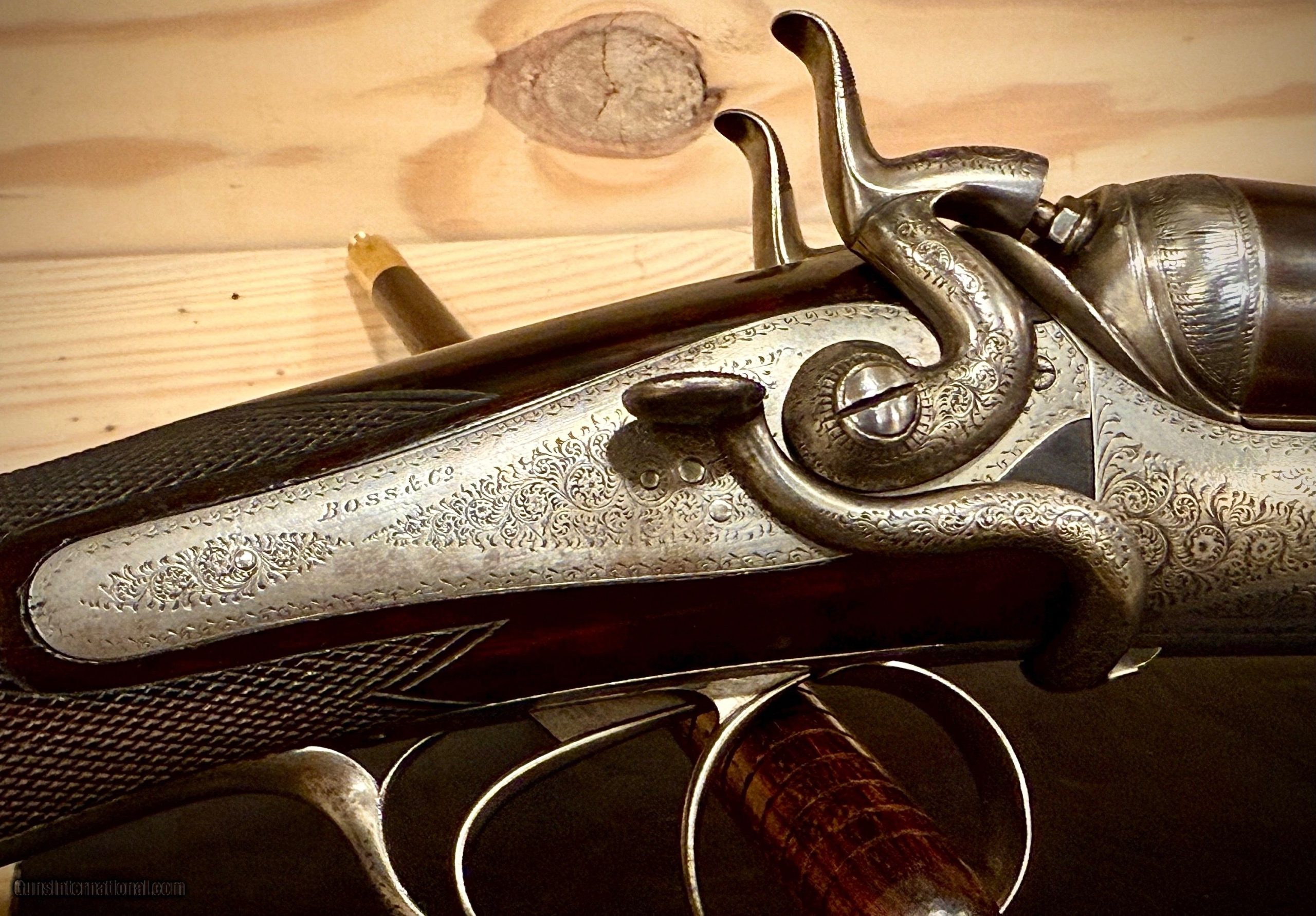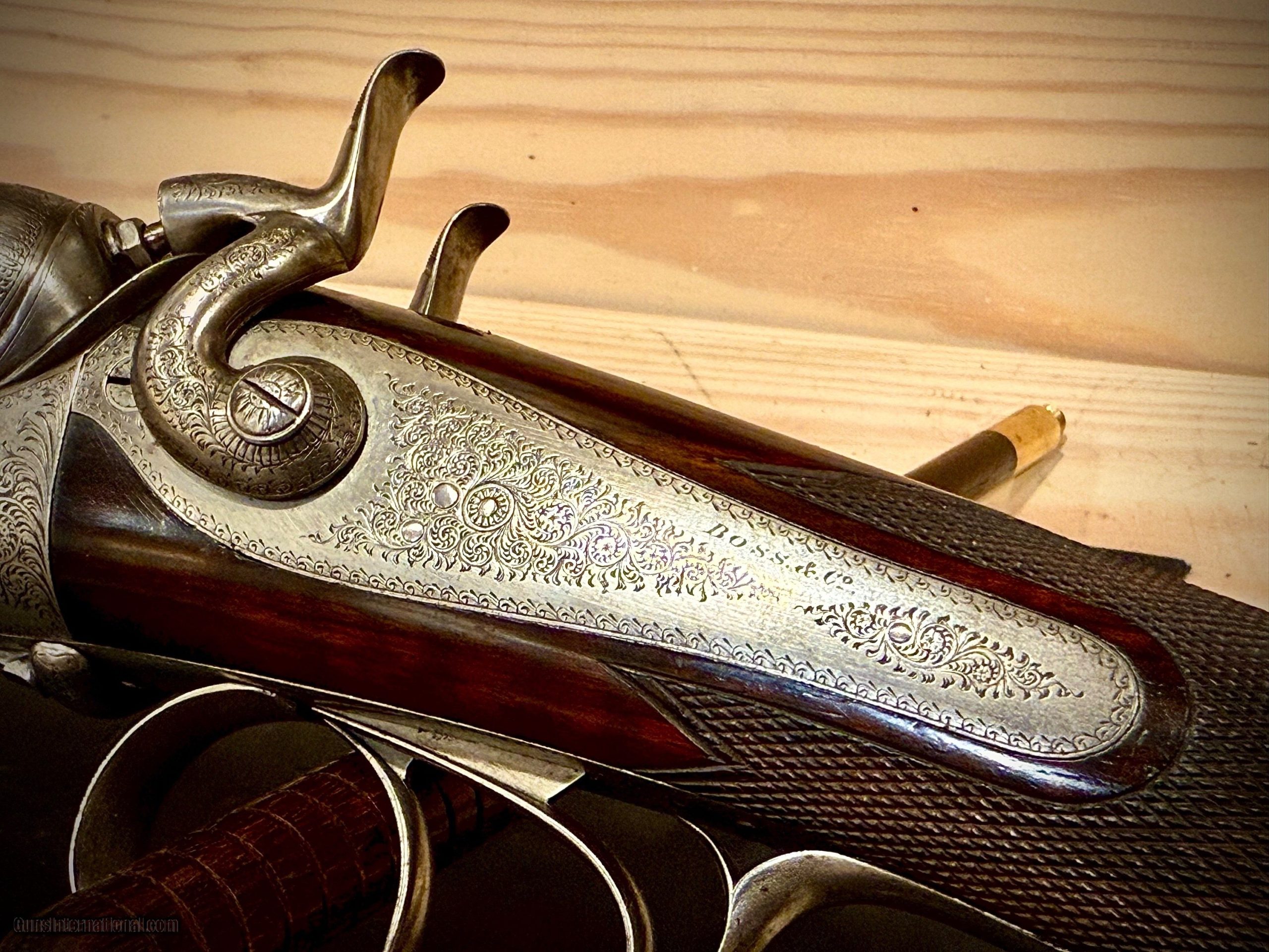 The action and island locks are elegantly engraved in fine, detailed scrollwork, with the maker’s name “BOSS & CO.” at the top of each lock. Fore-end latch with comparable scrollwork has finely checkered wood.