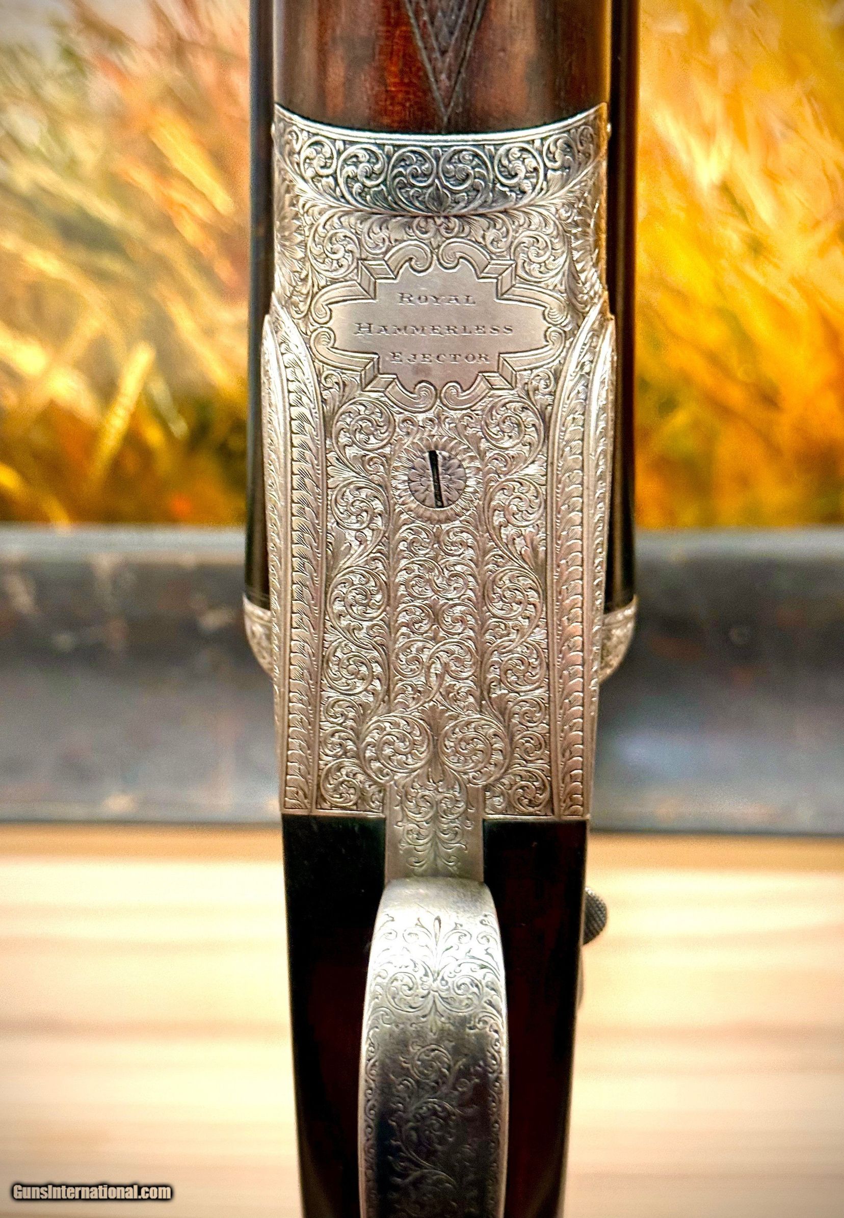 Holland & Holland 12 bore rounded bar sidelock ejector Royal model, serial number 16xxx. Made in 1897, bore measurements .729+ & .729+. Wall thickness measurements 28,000th & 27,000+th. 28” nitro proofed new barrels made by the maker in 1973, virtually no use, rib gold-inlaid ‘2’ at the breech end, 2 1/2in. chambers, bored approx. 3/4 and 1/4 choke, toplever gold-inlaid ‘2’, automatic safety with gold-inlaid ‘SAFE’ detail, gold-inlaid cocking-indicators, best bold Royal scroll engraving, the underside with an elaborate cartouche engraved ‘ROYAL HAMMERLESS EJECTOR’. 28” barrels 14.5” stock. In Holland & Holland case.