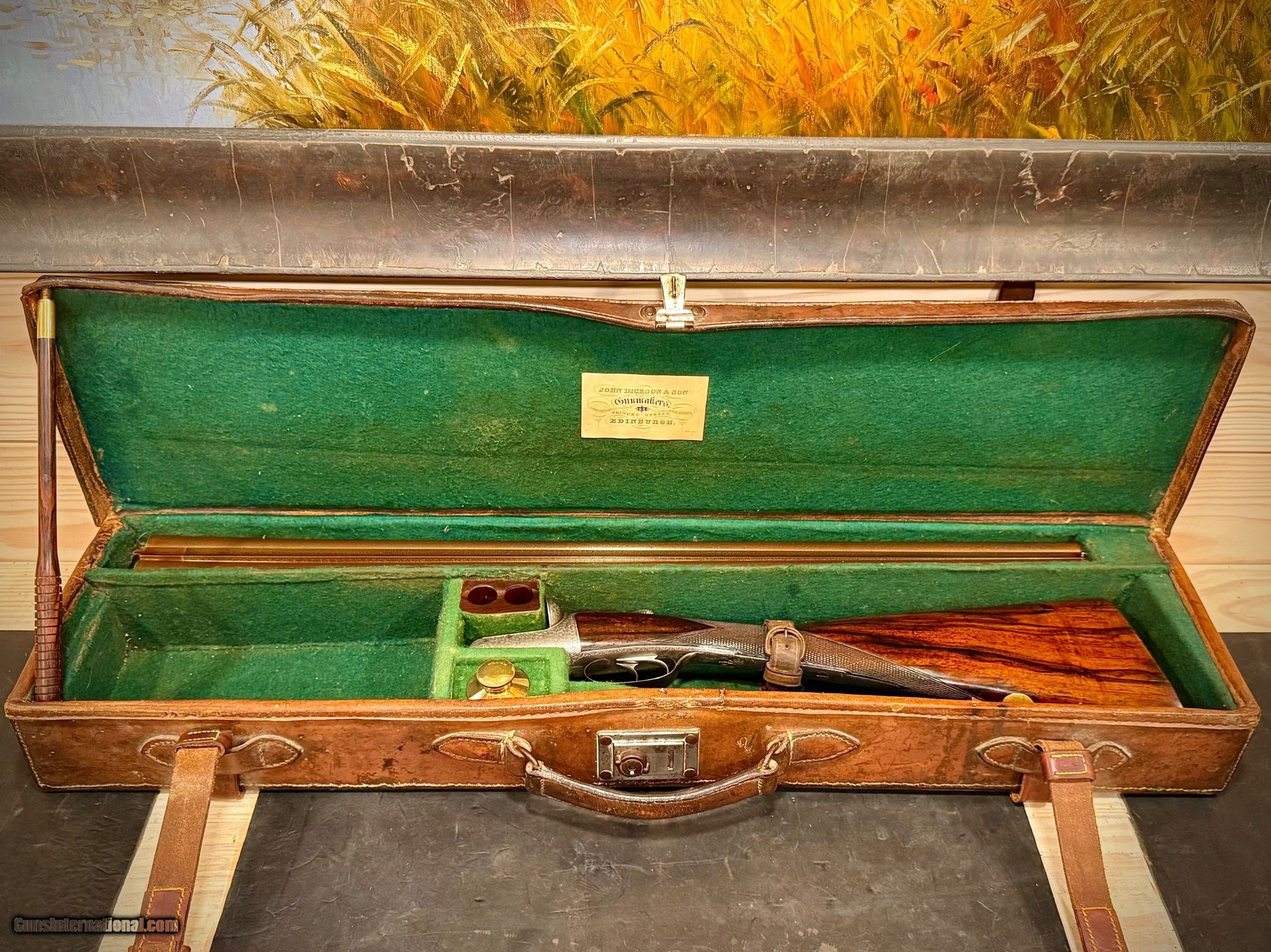 Just arrived from a private collection. John Dickson & Son 12 bore round action ejector, serial number 46xx. Made in 1893, wall thickness measurements 24,000+th & 24,000+th. 28” barrels, 15” stock, original proof marks. Widely regarded as Scotland’s finest gunmaker, with his round-action guns on par with Holland, Purdey & Boss. In the Dickson gun case.